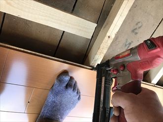 新規に根太を重ねてフローリング床を設置できるようにします。根太とはフローリングを設置するための設ける木枠のことです。これまでの根太の対角になるように新たな根太を作ります。対角に組み上げることによって重さを分散し、これまでの根太の負荷を減らすのです。バリアフリーになるよう、なるべく床の段差ができないように根太の高さを合わせます。