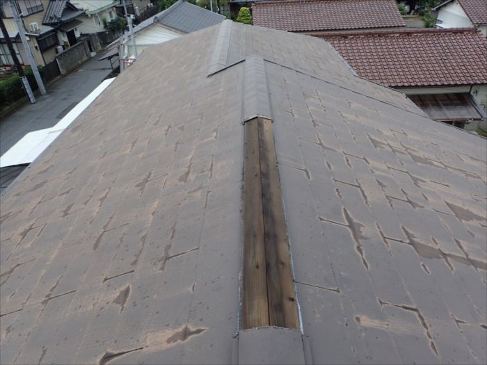 一番頂上は山形になり、雨にも強い鉄板により保護いたします。釘などで止めることが多いため、下地には木を使うことが多かったのです。本来は棟板金の交換を屋根塗装とともに行い、下地の貫板も取り替えることが理想です。そのことを知らないことも多く、表面の保護のみでメンテナンスを完了したと思っている方も多数います。施工会社の説明も不十分で、このように大風が吹くと結果的に飛散してしまいます。