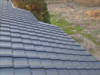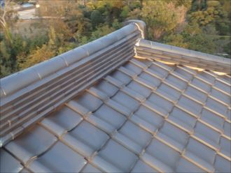 屋根の上に上がり細かくチェックを致します。今回の台風でも間違えなく強風が吹きました。弊社ではそのことを考慮して、しっかりと屋根葺き替えを行いました。瓦の飛散や割れなどは見当たらず、漆喰も問題がありません。お客様が心配していた瓦の破損などはなく、良好な状態でした。