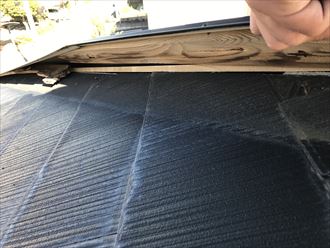 調査にお伺いしたところ、屋根の棟板金が持ち上がっていましたが飛散はしていなかったので、一見何事もない様にも見えました。しかし、風が吹く度に棟板金が捲れ上がっています。棟板金の下を見てみると、木製貫板ごと破損しています。木部の劣化が原因で剥がれ掛かっており、下地である貫板は寿命が来ていました。屋根自体をメンテナンスするのは普通のことですが、棟板金を外して貫板のメンテナンスする人はいません。トラブルが起きてからでないと交換することはなく、状態がどのようになってるのかも壊れてみないと分からないので、厄介なところです。