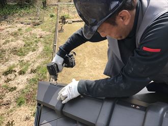 今回の工事では同じことが起こらないように、下地には樹脂製の貫板を使用します。商品名はタフモックです。樹脂製の貫板は、経年劣化しにくく、腐ることがありません。耐用年数も木製の貫板下地に比べ、大幅に伸ばすことができます。ビスによる固定法で、振動などによる釘抜けなどの予防も行いました。