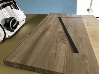 タモ材は無塗装なのでシミが付きやすいため、油性のニスを塗装いたします。木目本来の味の出るクリア色で塗装いたしました。本来はこの幅の窓枠用は販売していないため、特注での商品になりました。そもそもカウンター材としては幅があると厚みが同様に厚くなるからです。厚みが出てしまうと窓サッシに取り付けることができなくなってしまうから特注商品になってしまいました。