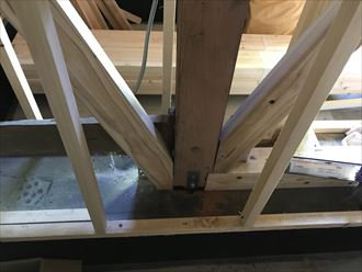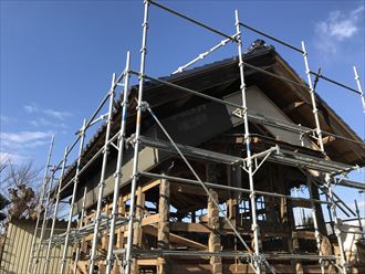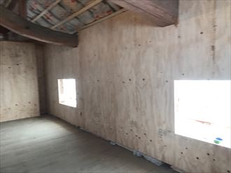 今回、筋違いの補強ともう一つの補強は構造用合板により内部壁面を全て補強しました。ツーバイフォー方式です。壁面をベニヤ補強をする事により、既存の土壁同様に一枚の壁にしてしまいます。今回の工事では構造体から壁面の補強と二重の耐震補強をしました。建て替えるのではなく、補強する事により昔の建物もこの先残して行くことが可能です。