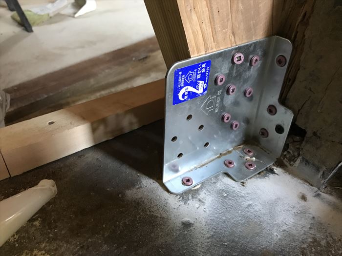 今回の補強方法は筋違いを柱との間に入れ込みます。筋違いの役割は横方向の揺れに対して効力を発揮します。昔からある技法で在来建築にも適用されています。柱は上からの荷重に耐え、筋交いは横からの力に耐えるのです。建物の構造を見ると筋違いは必ず縦方向と横方向それぞれに入っています。どの方向の力からも耐えられるようにです。現在では筋違いボックスと筋違いプレートなどの金物があります。今回の工事では写真のように筋違いボックスを採用いたしました。決められたビスの本数は一枚のプレートで15本です。土台部分と柱部分と筋違いを一枚のプレートで止める事ができます。
