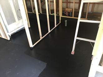 土間の打っちぱなしの部分に備長炭の塗料を塗装することにより床下での湿気のコントロールしてくれます。除菌効果もありカビの発生なども抑えてくれる塗料となります。一階の仕上げになる床フローリングの下地になる工程をご紹介いたします。
