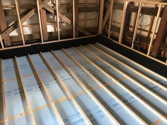 今回の改修工事の目的は、蔵のイメージを損なわないように、ある程度居住空間として使用できるように改修工事を致します。元々人の住むようには作られていないため、快適空間に変貌を遂げるように改修工事をします。床になる部分は一度貼りますと問題が発生すると壊さなければ、直すことが出来ないため失敗のないように施工します。IPエコロ(備長炭)塗料とスタイロホーム(断熱材)を兼用して床下の問題を解決いたします。土間はコンクリートですので気候に左右され床下の温度が変わるため断熱材を隙間なく敷き詰めて参ります。根太材を水平器レーザーで一本ずつ見て行きます、根太材に凸凹があると仕上げ材を貼る時に上手く張れなくなってしまうため一番気を遣う場所です。