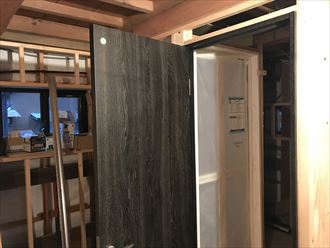 全体に貼ったのはスモークオーク柄といい種類の中で一番濃い色になります。濃い色を室内に入れると部屋がしまった印象を与えるため高級感の印象を与えます。扉も同色にして一体感を出しました。同じ商品同しを設置する事により統一感が出てあとあとのコーディネートが考えやすくなります。