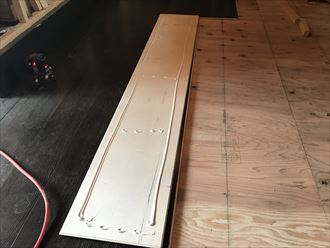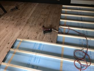 床下地を組み込み、その土台として根太を組みます。下地の根太の上には先行床として構造用合板を張り、強度を出します。一階なので床下からの室温低下を遮断するのに今回はスタイロホームを敷き詰めました。仕上げ材と下地材として二重の床組みになります。仕上げ材には床鳴り防止としてウレタンボンドを付着させます。床暖房ではないのでボンド付着は不要ですがウレタンボンドを付着で施工するとフローリングの湿度に伴う伸び縮みに対して対応できるので、一枚一枚ボンド付けいたします。