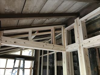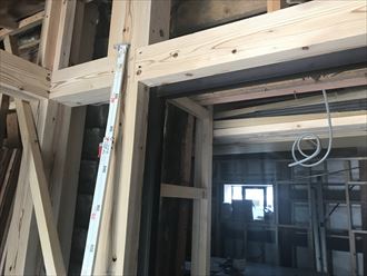 玄関サッシを新たに設置する場所は柱の入れ替えが必要でした。今回は引き込み引き戸なので下地の作りには工夫が必要です。内壁、中壁を設置と同時進行で設置しなくてはいけません。軸組になる柱は設置後は引き込みサッシです。調整ができなくなりますので、確実な設置が必要です。中で不具合が生じると、壁ごと壊さなくてはいけなくなります。
