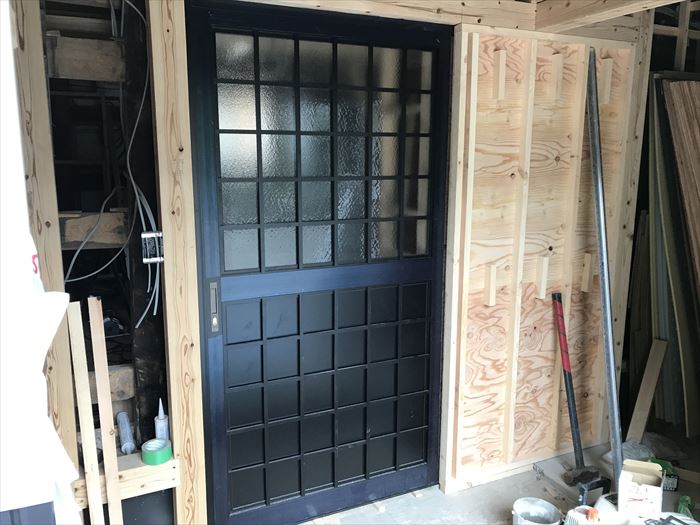 君津市の蔵の改修工事で玄関サッシを取り付けました。玄関ドアはお家の一番の顔ともいえる場所にあたります、玄関のイメージで見た目にも大きく差が出ます。