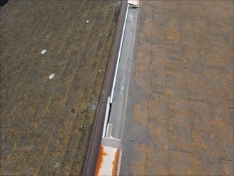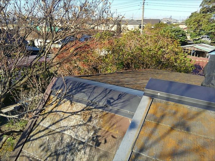 新たな棟板金を設置しました。現在では棟板金の固定する貫板を樹脂製にして、劣化しずらくする方法もあります。また、釘ではなく、ビス締めにしてより強固にすることもできます。貫板に樹脂製のタフモックを使えば、腐蝕に強いので安心です。