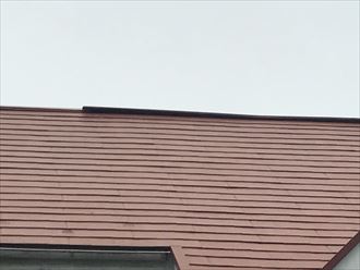 幸いにも少し離れると棟板金が浮き上がっている箇所が確認できました。被害は大屋根の棟板金です。夜の内に大風で捲れ上がったのでしょう。お客様のお宅は小屋裏が有るらしく、3階建てと同じくらいの高さがございます。風を返すものが周りに無い分、大風の影響を受けやすかったのでしょう。工事としましては、屋根足場も必要になります。作業に当たり、落下防止のためどうしても必要になります。急勾配ですと雨漏れがしにくい屋根になるのですが、不具合が生じると屋根足場が必要になり、少々高額なお値段になってしまいます。火災保険にご加入している方は、保険で工事費を賄える場合。ご依頼をしていただきければ、火災保険への申請もいたします強風を受けた方は、一度ご相談ください。良い解決法をご提案いたします。