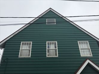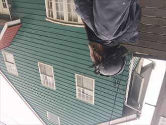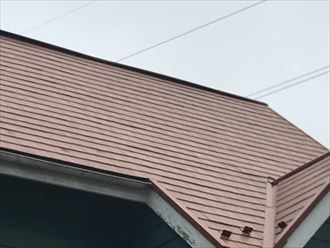 早速お電話いただいてすぐに調査させていただきました。屋根のことなので雨漏れなどの被害が拡大してはいけないため、弊社ではできる限り早目の対応をしています。午前中結構な雨風が降る中、調査しましたが、本来ですと、屋根の上に上がり、直接みたかったのですが、お客様のおすまいは、、屋根の勾配が6寸以上あり、雨が降っているため、上ることができませんでした。切妻屋根であれば、雨が降っていなければケラバ(屋根の一番端)を伝って上ることができます。