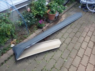 市原市のお客様は朝方、風が落ち着いてから外に出てみると、屋根の棟板金が台風21号の大風の影響で庭に落ちていてビックリしたそうです。普段あまり目にしない金属片が庭に落ちていると、屋根の上で何が起きたか解らず、慌ててしまうかと思います。
