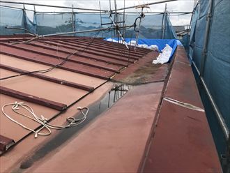屋根自体は瓦棒のトタン屋根でした。勾配がほとんどありません。こう言った状況の屋根にはパラペットなどが設置してある場合が、多く見られます。近隣との立地条件下で光効率などの規制がある場合で、屋根の高さが取れない場合などにもよく見かけます。腕壁などとも言われています。特に屋根勾配がほぼ取れない状況では、水はけや雪の落下防止などに役に立つ事があります。屋根勾配が取れないと、屋根つま先などの防水処理に困ってしまうわけですが、立ち上がり(パラペット)を作ることにより防水紙などの立ち上がり箇所の確保などの役割も有ります。