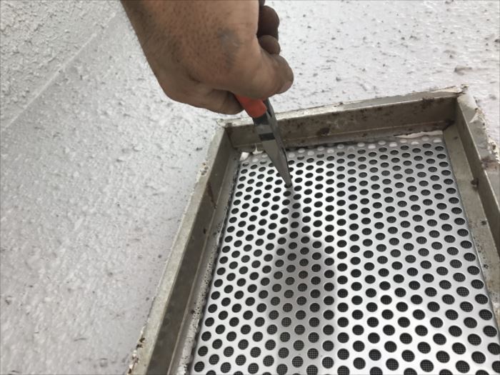 お客様のお住みになる地域は比較的海に近く、金属のものは塩害の被害が目立ちます。今回の修理に使用したのはHIKARIメーカーのPS69-624ステンパンチング、0.6ミリです。比較的、塩害に強い商品になり、これまでに使用されていた0.3ミリのものの倍の厚みの商品になります。パンチングの穴の大きさは4ミリです。4ミリというと、小さい虫などは侵入してくると思います。それを防ぐため、今回の工事ではステンレス板裏側にネットを貼り付け、お客様の不安要素を除外いたしました。