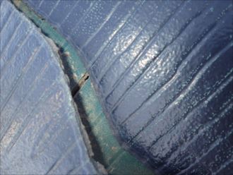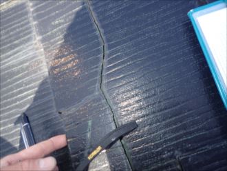 屋根材(スレート・コロニアル・カラーベスト)にも被害がありました。見つけにくいところですし、実際に屋根の上に上がらないと解らない部分です。放置していると雨漏れの原因ともなりかねません。思っているよりも屋根がダメージを受けていることは多いのです。