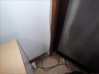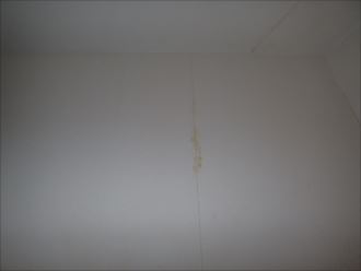 今回の雨漏れは壁の内側に発生しています。新しいビニール樹脂のクロスの表面は撥水しますので、表面に染み出ることが出来ず、クロスのジョイントやコーナー部分などに現れやすいのです。