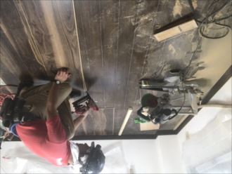 工事を終わらすことよりも、その後の仕上げ作業が大変です、床材(MDF)を電動工具などを用意て切断すると、細かな粉状の粉末になってしまいます。通常のほうきなどでは取り除くのは難しく掃除機などを多用して綺麗に清掃いたします。どうしても機械などでは限界があり、最後はやはり人間の力が必要です。傷のチェックやボンド等の後など全てチェックいたします。なるべくお客様の生活リズムを崩さないように限られた時間にきりが良く工事を終了できるように、工事時間を考えながら工事を進めて行きます。