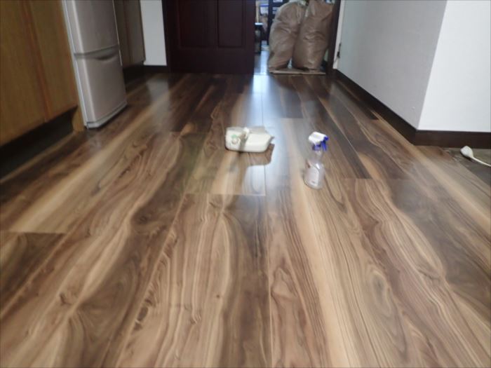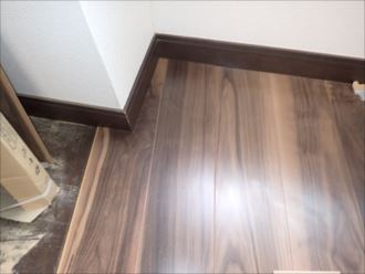 今回カバー工法で使用いたしました商品はパナソニック製品で6mmリフォームフロアーAウォールナット柄(シート)と言う商品です。厚みが6mmですので、張り替えた後などに違和感が無く、敷居などの段差が少ない時など厚みを出したくない時に使用いたします。通常の12mmフロア材と性能は変わらず、水廻りなどにも使用できるハイブリットなフロア材になります。短時間で施工が出来て、既存フロア材がしっかりとしていれば問題なく工事でき、お勧めです。