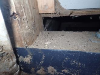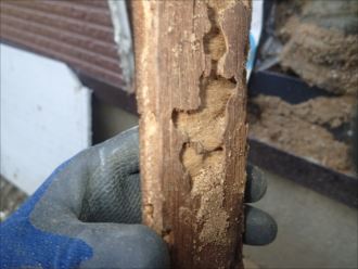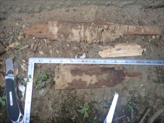 木部の食べられ方ですと、明らかに白蟻です。侵入したところは、土台から入りこみ上に上へと進んだ模様です。ただ肝心の白蟻が確認取れないのですが、恐らく黒蟻により白蟻が駆除され、白蟻の作った巣を横取りし、そのまま住み付いてしまった模様です。黒蟻は白蟻のにように木部はほぼ食べませんが、巣を広げていくため、あなどれません。早急な対処をしなくてはいけません。