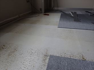 フロアカーペットは汚れた場所の張替えが簡単にできるようになっています。専用ボンドでの施工で何年経っても粘着します。ただ長年、同じものを保管している必要があり、カビなどにも気を付けなくてはいけません。今回はそんな手間暇やランニングコストの悪条件を解消できるフロアタイルへ張り替えます。フロアタイルは表面が硬く、塩化ビニル樹脂などで出来ているため、汚れたら簡単に清掃が出来て、傷がつけば張り替えられます。フロアカーペット同様専用ボンドは長年粘着が保たれ、剥がしても張替えが可能です。