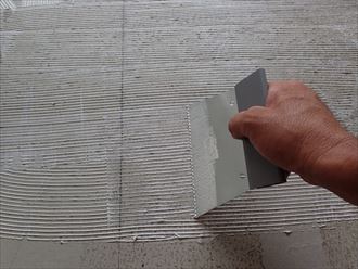専用ボンドにて、一枚一枚フロアータイルを貼って行きます。組み合わせることにより、大きな空間に貼ることが出来て清掃も簡単になり丈夫で清潔。しかも、清掃業者のランニングコストがかかりません、これは本当におすすめです。