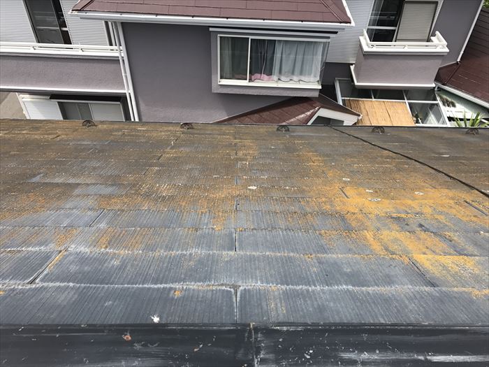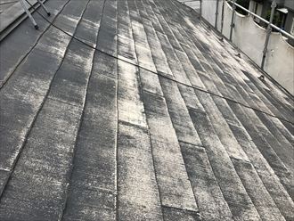 屋根のコケなどはたわしで擦ってもなかなか取れないのですが、業務用の高圧洗浄では一瞬で取り除くことができます。屋根はスレート瓦でしたがコケが塗装を腐食させ、瓦の内部まで侵入していました。高圧洗浄をするとコケを取り除いた場所の塗料までなくなっていることがよくわかる写真だと思います。コケなどをなるべく早い段階で取り除かないと塗料が無くなります。残った部分は瓦のコンクリートのみになるので雨水が浸透しやすくなってしまいます。