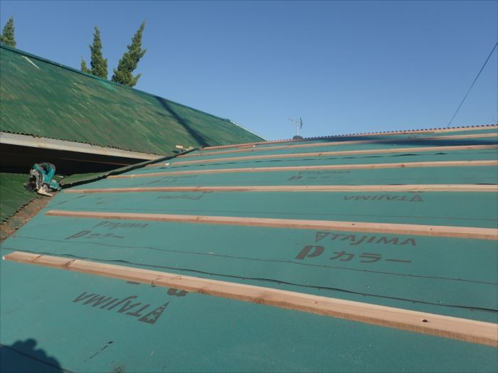 波板トタンを継ぎ接ぎにして雨漏れを凌いでも、根本的な解決には屋根の状態からして、良くない事でしたので、既存のトタンを全て剥がし下地からやり直します。既存のトタンは劣化が酷く簡単に剥がせます。既存のトタンは屋根の下地のベニヤに直接打ち付けていたのですが、雨漏れや今後のことを考えて下地ベニヤに防水紙を敷き、桟を打ちます。桟に釘を打つことによって、雨漏れがしにくくなります。