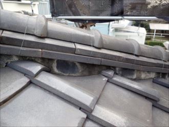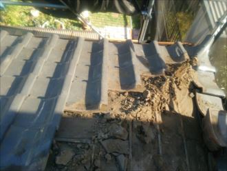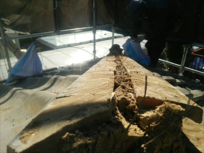 のし瓦を外してみると一番下の段が平らになってしまっています。幾重にも積み重ねて行く棟ののし瓦ですが、積み方によっては雨が降ると返り水という現象が発生します。一見、平らで綺麗に見えますが、これで屋根の下り方向に雨水を排水できず、棟の中へと雨水が入り込み、浸透してしまいます。中央は屋根土だけで下地まで直接雨水が入り込んでしまうため雨漏れの原因になってしまいます。