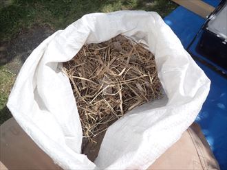 軒裏天井の化粧ベニヤが経年劣化により、大きく剝がれ落ちている部分がありました。所々に軒天の剥がれがありましたが、恐らく破風部分の塗装がなくなり、木質破風のため水が浸入してベニヤを劣化させたのでしょう。剥がれて来ている軒天の場所には、全ての箇所に破風のジョイント(継ぎ目)があり、そこから雨水が浸入していました。鳥はせっせと枯れ草などを運び入れ、なんと土のう袋の半分以上も屋根裏に入れ込んでいました。このように枯れ草などを詰め込まれてしまっては、浸入した雨水を滞留させてしまうため、軒天の劣化を促進させてしまいます。