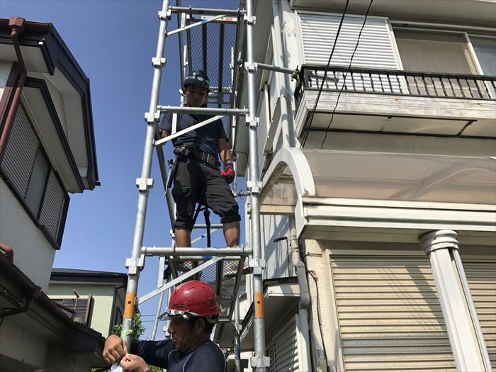 軒天は屋根にあるので作業するには仮設足場の設置が必要です。大きく開いてしまった穴の補修ですと、部分作業でも仮設足場は必要です。軒天の補修工事にはいくつかの方法があり、その中でも短時間で工事が可能なカバー工事がお勧めいたします。5ミリのケイカル板をウレタン系ボンドを併用して貼り付ける工事です。カバー工事では産業廃棄物がほぼ出ず、経年で化粧ベニヤのように薄く剝がれ落ちて来る心配がございません。