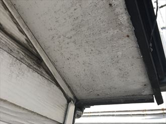 築47年というお客様のお住まい、十数年前に一度、外壁を金属サイディングでカバー工事したときに、軒天の塗装もしたそうです。金属サイデングの耐候年数は、各メーカー商品により異なりますが、10年以上がメーカー保証とされているものです。外壁を金属サイディングにして耐用年数を上げてても、軒天のメンテナンスは塗装のみで終わらせてしまう方がほとんどです。既存の軒天はベニヤで、塗装を施していても寿命が来てしまい、表面から剥がれてきます。