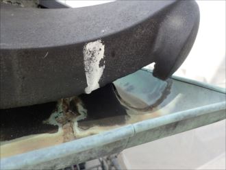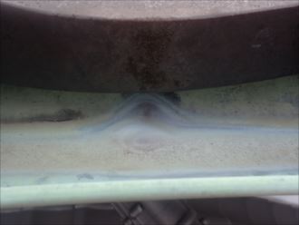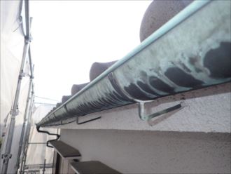 軒天換気口の工事をご依頼していただき、その仮設足場があるうちに雨樋の調査を致しました。目視上は銅錆が出ていますが、現在不具合などは無く問題なく機能しています。銅製雨樋は完成時とは色が変色して見た目にも全く変わってしまうので、傷んでしまったと勘違いしてしまう方が多くおられるそうです。しかし、実は非常に高価なだけあって、耐用年数が長い商品なのです。