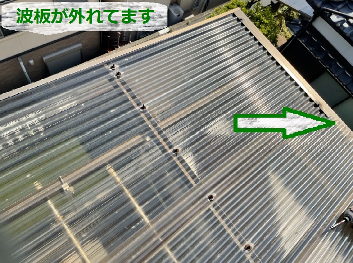 熊取町のI様邸の屋根修理です。I様邸は化粧スレートと言う平型の薄い屋根材を葺いた屋根で、台風の強風で、屋根の一部のスレートと一緒に下地の野地板も飛散してしまいました。屋根に穴が開き、台風時には大量に雨水が浸入してきたとのことで、ブルーシートでしっかりと応急処置さ ...続きを読む2026/02/19 三田市 ベランダ屋根工事で経年劣化した波板交換を行いました!