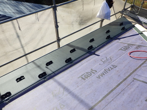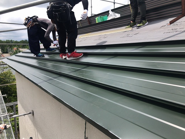 那須塩原市の屋根葺き替え工事で谷樋周りを納めました。 西面1段目のルーフ貼り付け中です 水切りスターターの溝に、横暖ルーフの爪を引っ掛けて直線を確認してから、釘打ち機で固定していきます。 釘打ち機は300ミリ間 ...続きを読む2022/08/2 小平市天神町にて築40年のスレート屋根には複数箇所で大きなひび割れが見受けられ、寿命を迎えている状態でした