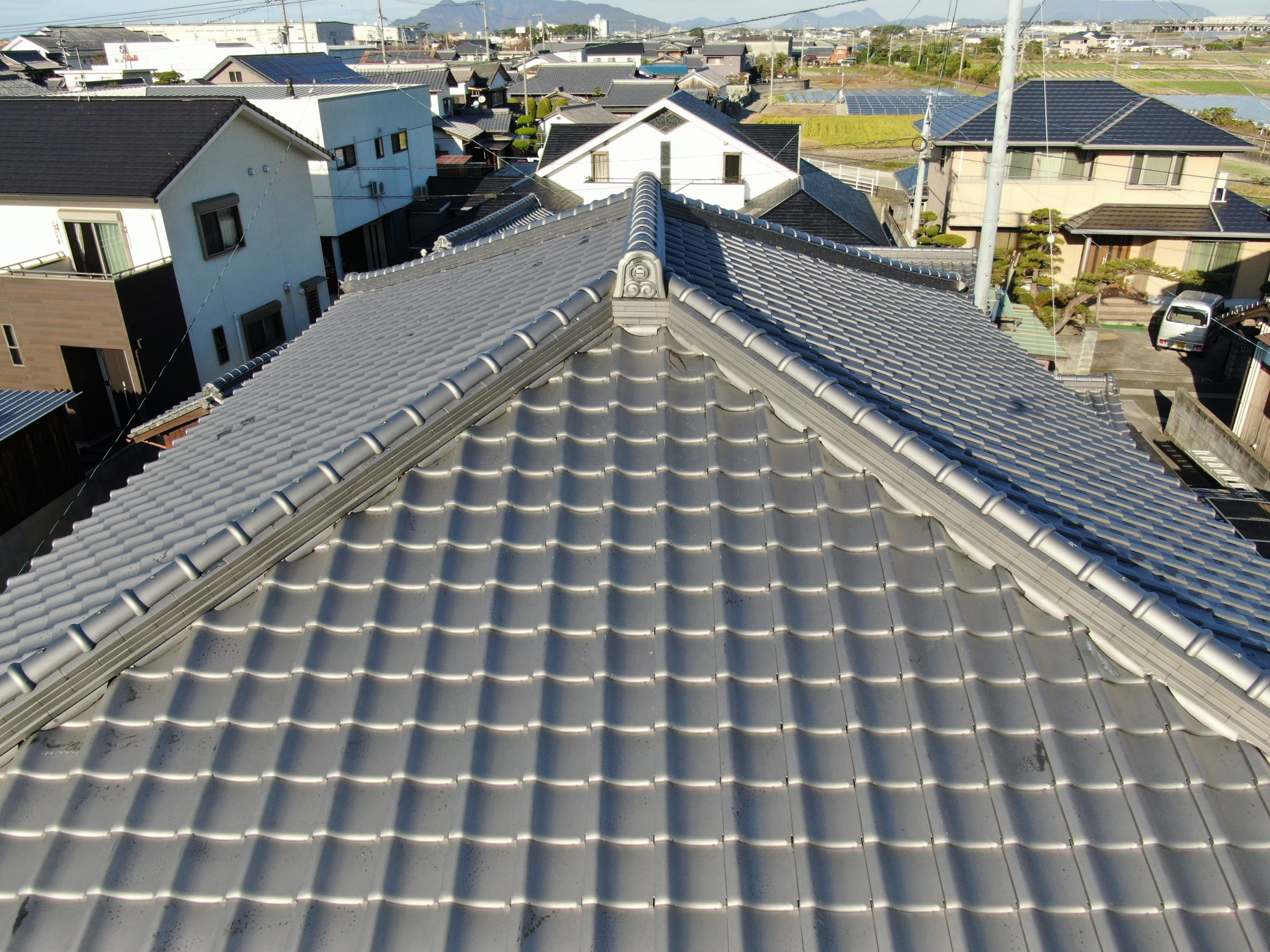ドローンで空から点検!どんな屋根でも見れちゃいます! 屋根の上でもしっかり確認。 屋根の上からしっかり確認!キレイな屋根ですね、見た感じまだまだ元気そう!瓦も一糸乱れず揃っており、棟もまっすぐに整っていて大変状態が良い ...続きを読む2022/08/2 岐阜市にてモニエル瓦に苔が生えてしまっているので現場調査に行ってきました