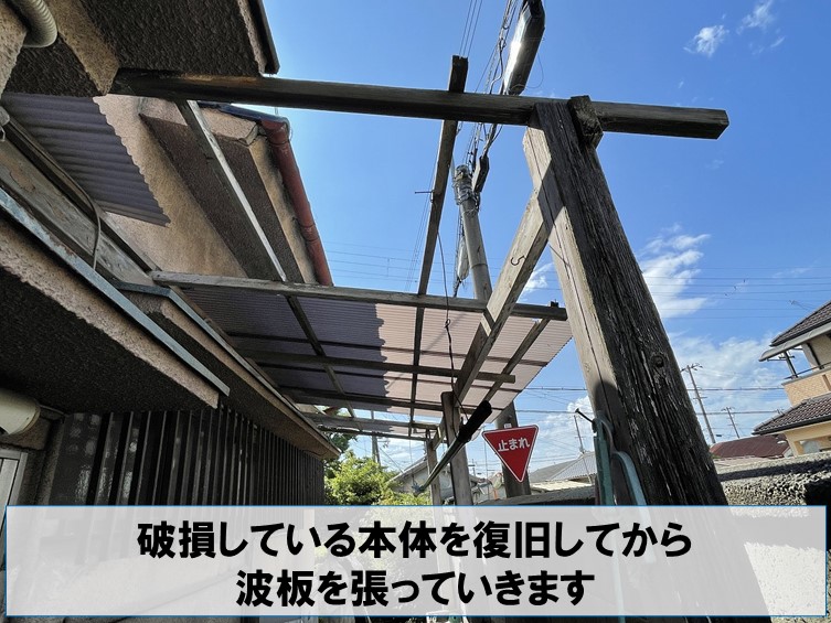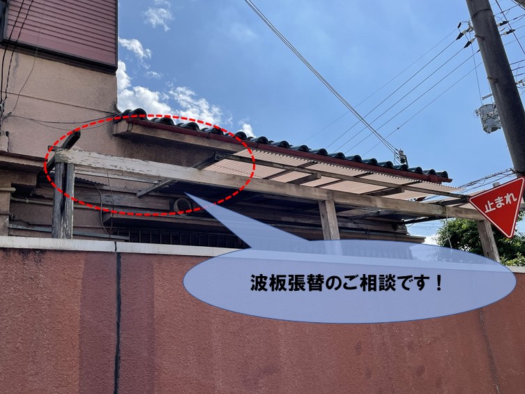 みなさまこんにちは!街の屋根やさん和歌山店です。木製のテラス屋根が劣化しお困りの方はいませんか?和歌山市在住K様より、木製のテラス屋根が飛散したので、修理してほしいとのご相談を頂きました。調査へお伺いすると、ガラスネット入り塩ビ波板が割れて飛散し、テラス本体の塗膜が剥がれて木部が腐食していました。テラス本体を ...続きを読む2022/07/26 名古屋市西区にて飛び込み業者による屋根の不具合の指摘調査
