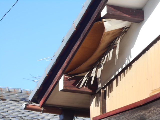 大垣市のお客様から「カーポートの屋根が台風で飛散してしまった」とのお問い合わせがありました。 早速カーポートの点検にお伺いしました。築年数がかなり経過していました。 年数から言ってアクリル板でした。 カーポートは屋根と柱と梁の簡易的な車庫のことを言います。 現在は屋根材はポリカーボネートが一般 ...続きを読む2022/07/15 大垣市にて軒天の現場調査に行くと雨漏りの影響で軒天が腐食してしまっていました