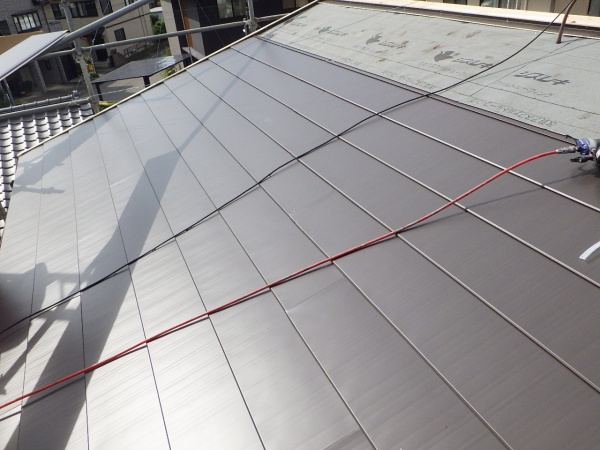 宇都宮市の屋根葺き替え工事で役物板金を取り付けました。 横暖ルーフの貼り付け中です。 昨日の続きで、西面のルーフを貼り付けていきます。 大棟との取り合いは残り幅を測り、ルーフを竪 ...続きを読む2022/07/4 箕面市 瓦屋根リフォーム!屋根の軽量化で耐震性を高めます