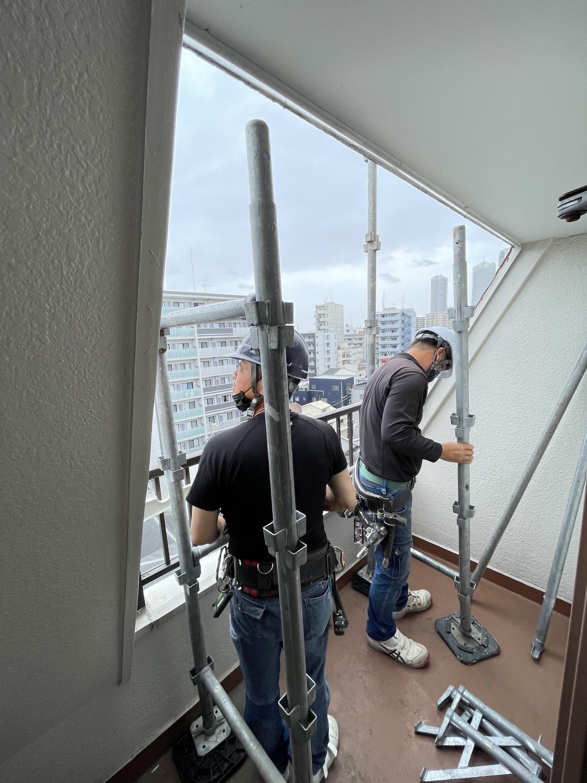 調査するための9階建てマンションの足場設置 まだ施工開始じゃないですよ。調査のための足場です。ベランダ内から踊り場にかけて調査対象範囲を仮設 ...続きを読む2022/07/4 和歌山市の屋根塗装、シーラーを吸い込ませてから遮熱塗料を塗装します