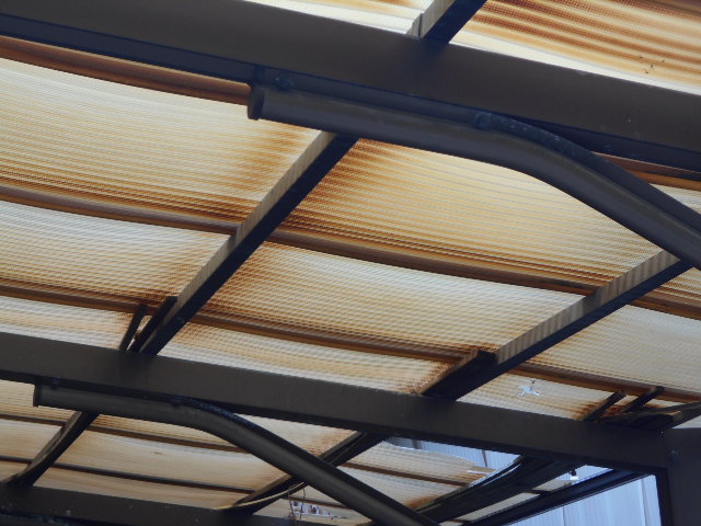 大垣市にお住いのお客様より「屋根材が反りあがって浮いてきています。何とかしてほしい」とのご相談をいただきました。早速調査に伺いました。屋根はカラーベスト屋根でした。築年数がかなり経過していてメンテナンスがされていませんでした。カラベストは平型化粧スレートのことでセメントとケイ砂を原料として繊維質で補強して成型 ...続きを読む2022/06/30 大垣市 カーポートの塩ビ波板が飛び散って穴が開いています。アルミの下地も曲がっています。カーポート調査