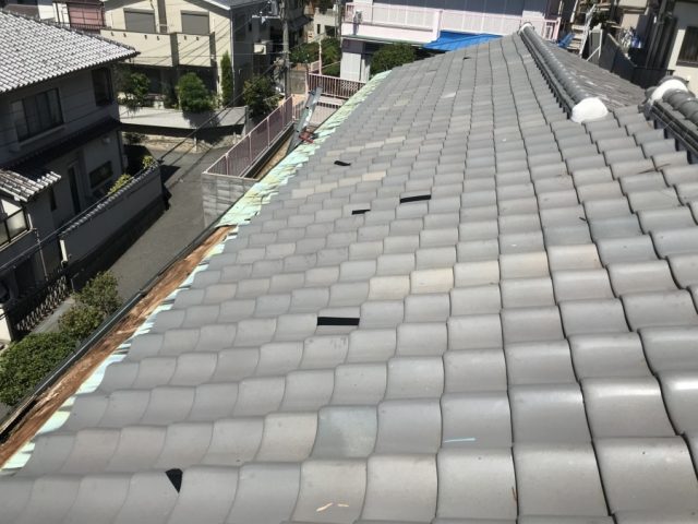 街の屋根やさん堺店です。南区で屋根点検調査と応急処置を行いました様子をご紹介します。建物詳細 木造2階建て住宅築年数  築約40年屋根材  無釉薬瓦相談内容前日の強風で建物に被害が無いかを確認すると、屋根瓦が落下しているのを発見。現在は室内で雨漏りは起きていないが雨漏りに繋がってしまう ...続きを読む