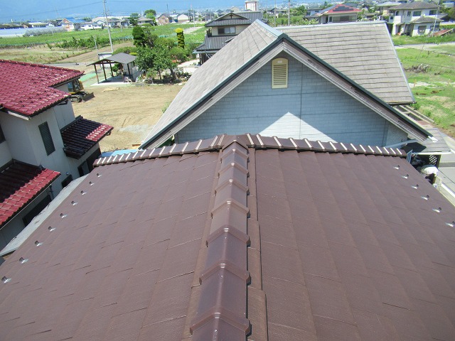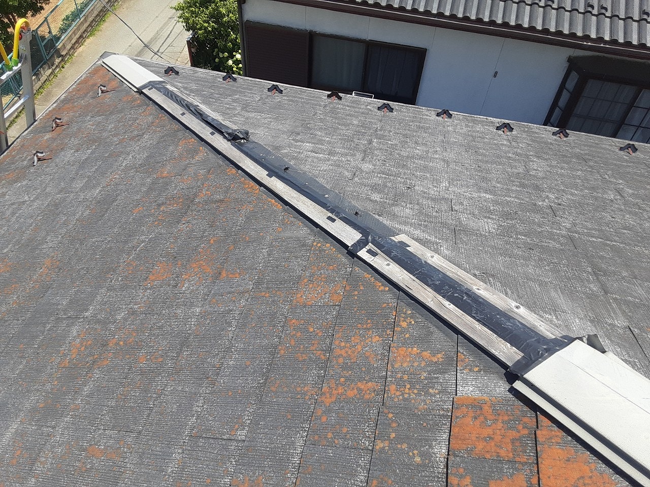 韮崎市で強風の影響により破損した、棟板金の新規設置工事を行いました!棟板金とはスレート屋根の頂点に設置されている部材のことです。写真は工事前の棟板金の写真になります。強風や経年劣化の為、クギ抜けや棟板金の浮きが ...続きを読む2022/06/10 笛吹市のオシャレな2階建て住宅で屋根の調査を行いました!