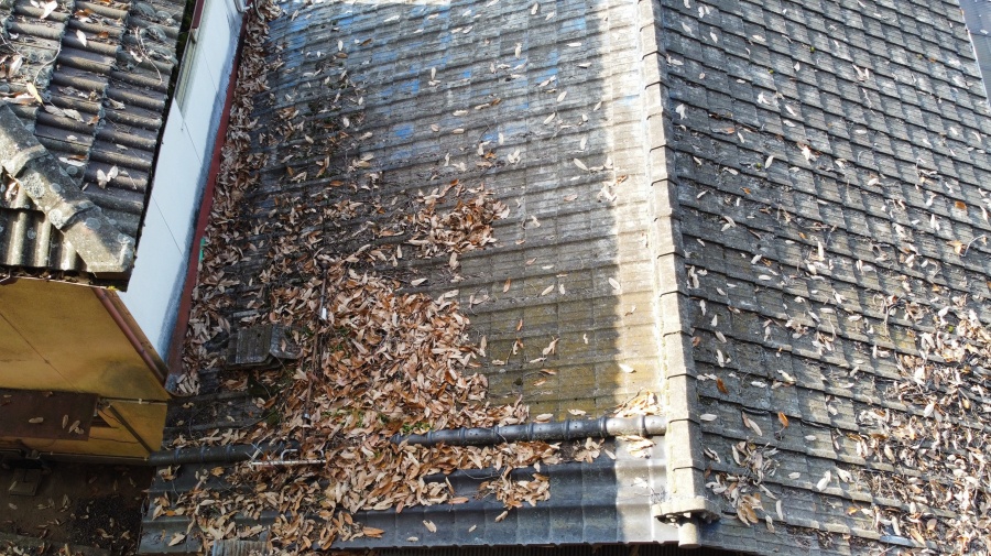 上空からのドローン撮影写真です。屋根形状がよくわかりますね。母屋に離れを増築したみたいです。それにしても落ち葉が凄いですね。裏側が山に面している為仕方ないのですが。離れとの取り合い部には谷樋があるのですが、落ち葉によって塞がれている状態に見えます。当然水の流れを止めていまうと雨漏りとなりますので ...続きを読む2022/06/8 倉敷市玉島で瓦撤去後の化粧野地板張替え工事中です