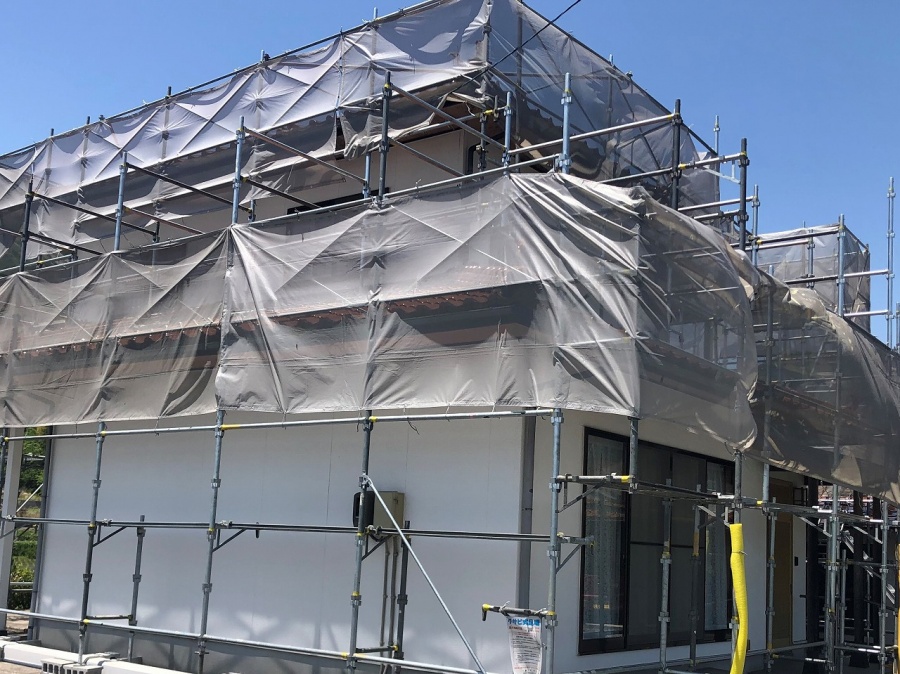 足場組が完了しました。今回は外壁工事は行いませんので、防護ネットは施工部分の破風軒天部に貼ってます。外壁は数年前に塗装されたそうです。白い壁が綺麗ですね。外壁塗装と同時施工でしたら足場費用が節約できたのですが、塗装業者からの提案は無かったとの事です。現地調査時に気付かなかったのでしょうか。モルタ ...続きを読む2022/06/8 倉敷市玉島で腐食した折板屋根の雨漏り補修工事です