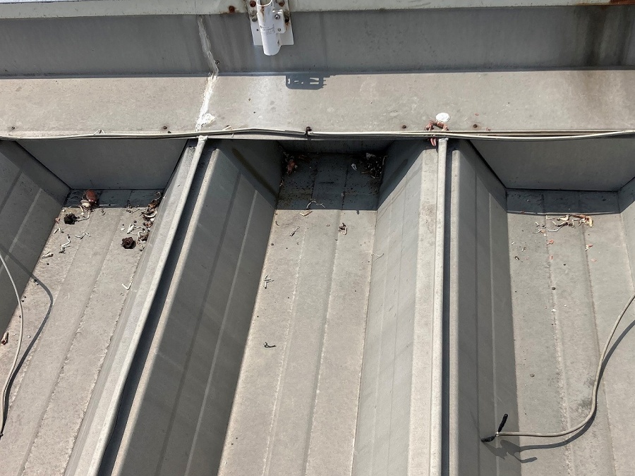 板金折板屋根です。塗装などのメンテナンスを行わず、永い年月が経過するとこんな状態になります。メンテナンスの重要さがよくわかります。谷部に腐食穴が見られます。この穴の部分の下は室内ですので、当然雨漏りとなりますね。今回は全改修までの応急と言う事で、あなの補修を行います。 ...続きを読む2022/06/8 倉敷市水島で店舗の屋上パラペット笠木の交換です