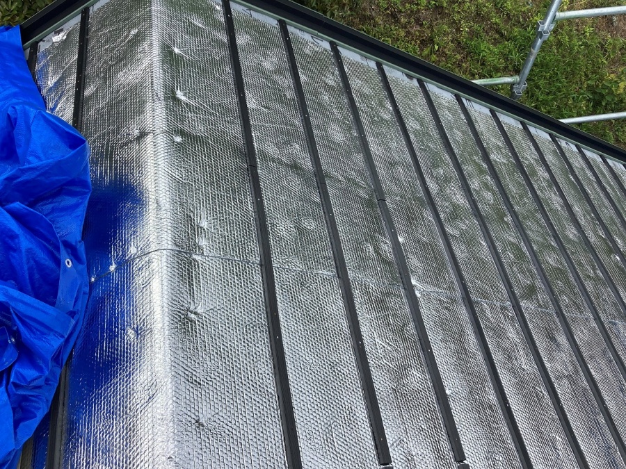 今回の工事は屋根を板金カバー工事、破風板金巻、外壁塗装が主だった工事です。その工事に伴って取り外す必要のある軒樋の交換を行う事にしました。築30年を超えていて、受金物の劣化、軒樋の劣化による変形破損が目立っていました。とても復旧して塗装と言うわけにはいかない状態です。容量的にも余裕があり、スタイリッシュな軒樋 ...続きを読む2022/06/8 倉敷市大島で、瓦葺き替え工事中、断熱材「アストロフォイル」敷き完了です