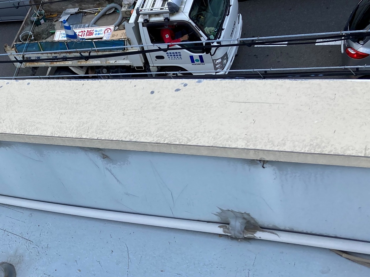 店舗の既存笠木を撤去した部分です。内壁部に穴が開いている部分にはアングルが付いていました。以前に照明器具を取り付けていたそうです。既存の笠木のかぶり寸法は4㎝程度でしたが、今回は開口部も覆うため、8㎝としました。既存笠木を撤去しアングルなどの付帯物をグラインダーでカットします。下地の凸凹は取付時 ...続きを読む2022/06/8 倉敷市玉島で店舗玄関ポーチ下がり壁の板金巻工事をしました