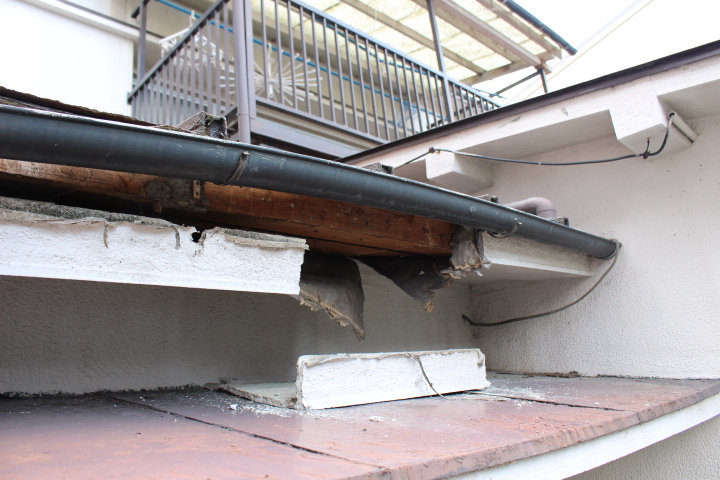 兵庫県西宮市のA様から「屋根の裏側が落ちてきたんですが、修理してもらえますか?」とのお問合せをいただきました。早速現場へ下見に伺いました。 1階の屋根(下屋根)の軒天部分が崩落していて下地の木材がむき出しになっています。 ...続きを読む2022/05/2 兵庫県尼崎市 スレート屋根に穴が開いていて雨漏りする現場